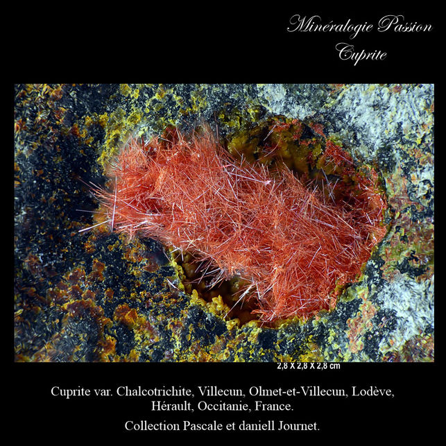 Mine de cuivre vitreuse en plumes rouges (Jean-Baptiste Romé de L'Isle 1783) cuivre oxydulé capillaire (René Just Haüy)