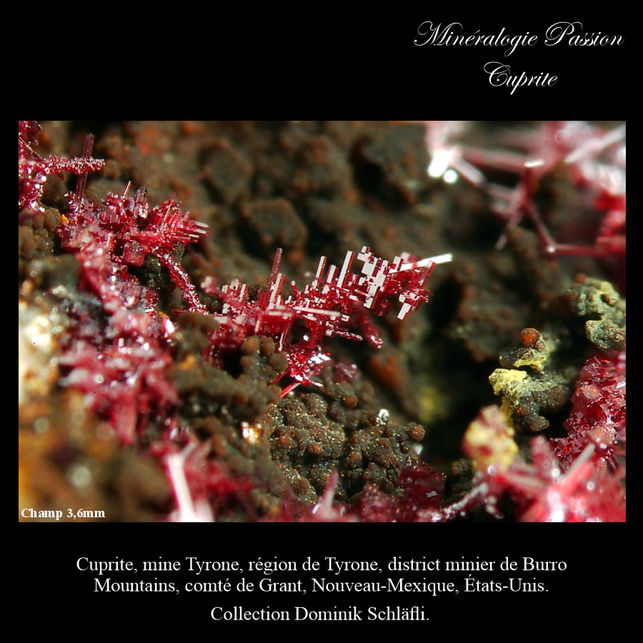 La cuprite est rouge et translucide en petits cristaux tandis que les plus gros cristaux sont souvent opaques, rouge sombre à noir avec des reflets métalliques.