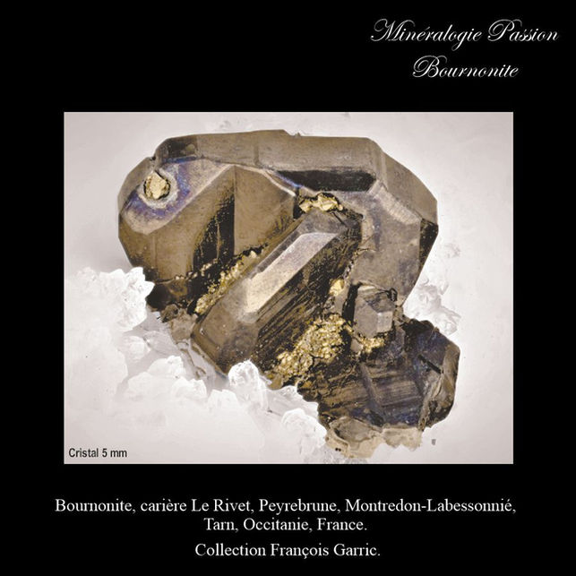 La bournonite est un des sulfosels les plus fréquents. C'est un sulfoantimoniure issu des filons hydrothermaux de moyenne et basse température et est connu dans certaines fentes alpines.