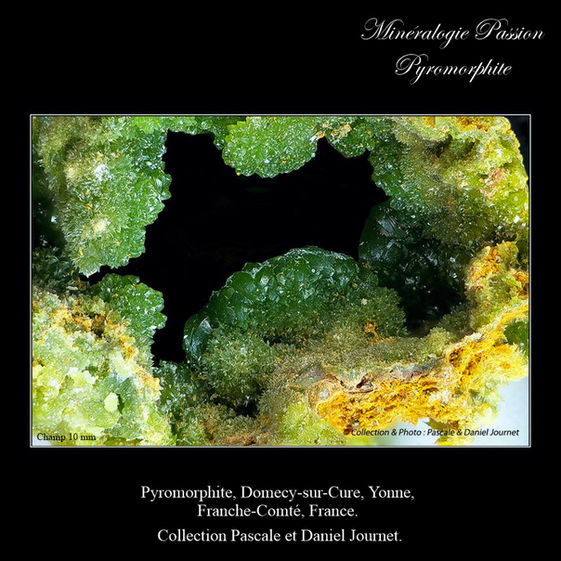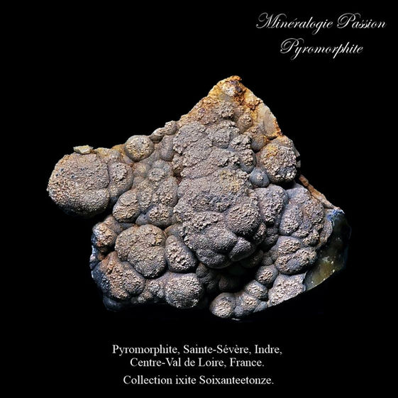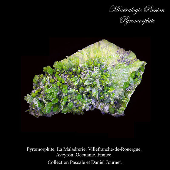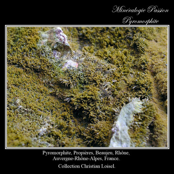 Ce chlorure de plomb phosphate forme une série complète avec la mimétite (chlorure d'arséniate de plomb) et de nombreux spécimens sont des intermédiaires entre les deux membres terminaux.